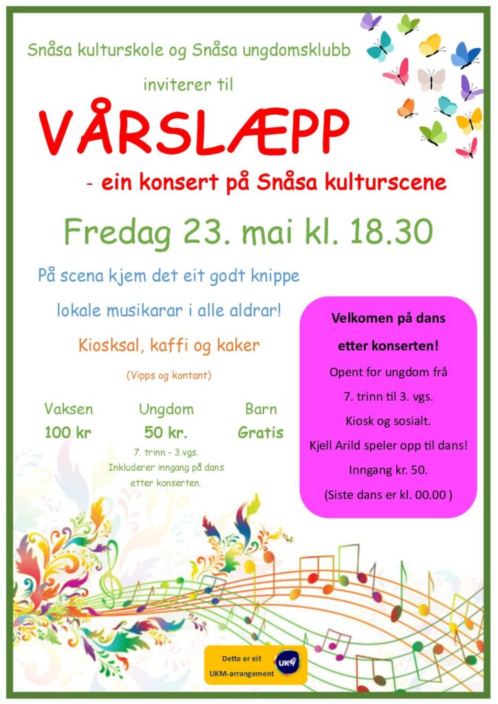 Snåsa kulturskole og Snåsa ungdomsklubb inviterer til VÅRSLÆPP – ein konsert på Snåsa kulturscene!