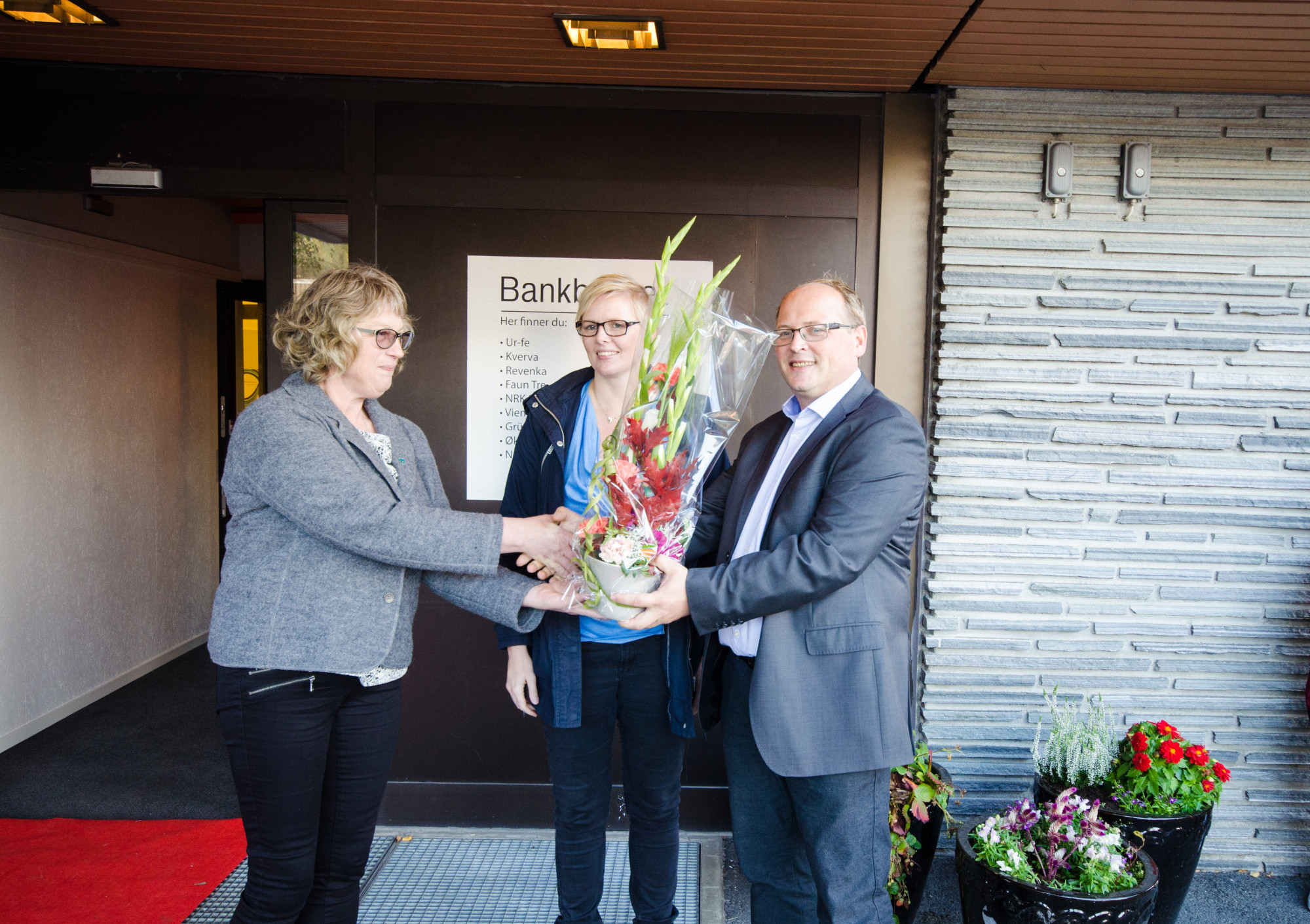 Ordfører Tone Våg overrekker blomster på vegne av Snåsa Kommune til Solvår Kveli i Økonomibistand Regnskap AS og Bård Landsem i Snåsa Næringsforum. (Foto: Hallvard U. Smestad)